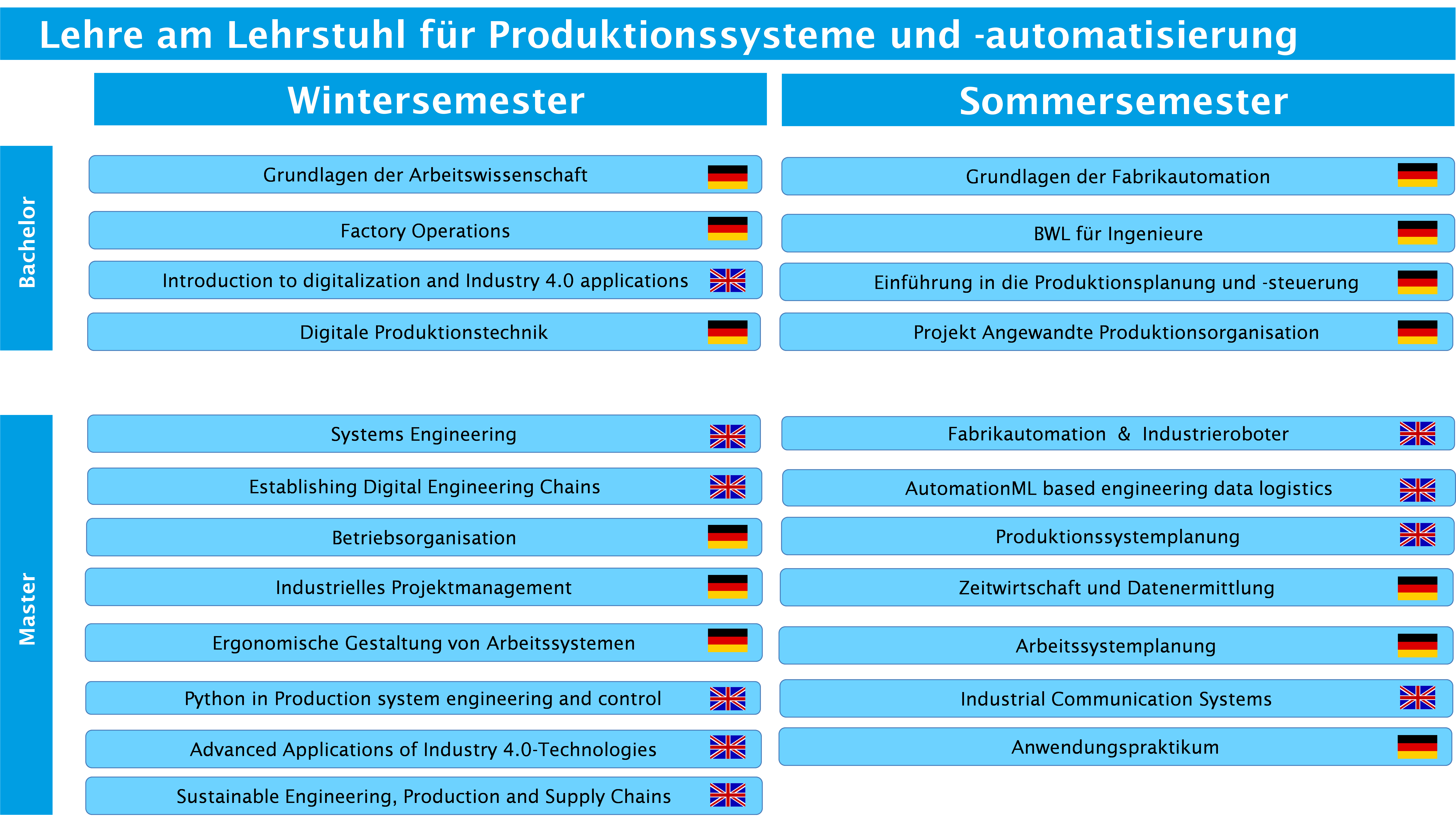 In diesem Jahr haben wir am Lehrstuhl die Überarbeitung unsere Lehrcanons weiter vorangetrieben und konnten nun ein in sich geschlossenes System an Lehrveranstaltungen entwickeln, dass alle relevanten Themenfelder aus Produktionssystemplanung und -betrieb abdeckt, von der klassischen Fabrikplanung bis zur nachhaltigen Gestaltung technischer Systeme und Prozesse reicht und sowohl Grundlagen als auch Expertenwissen vermittelt.